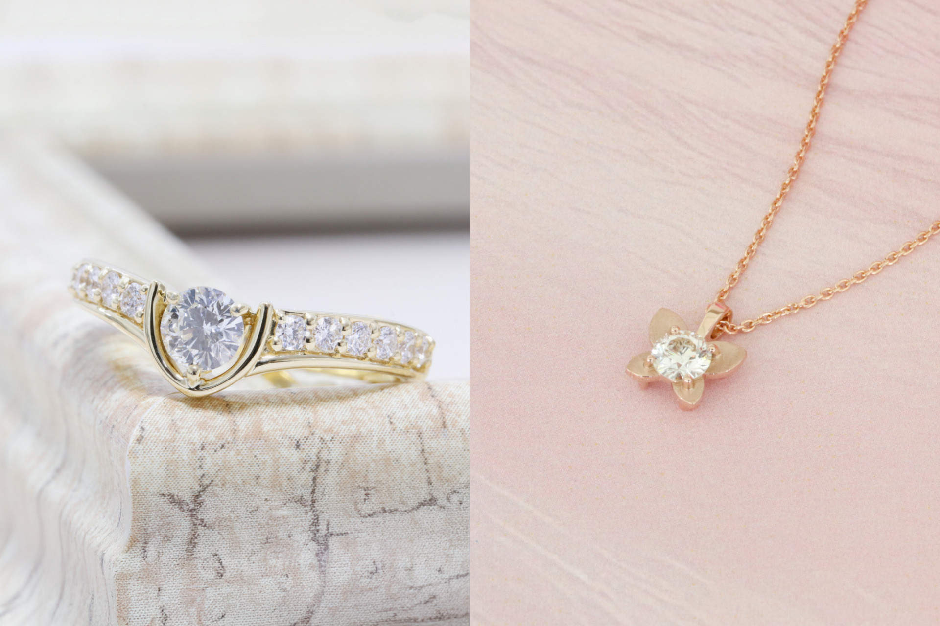 ダイアモンドは4C(カット・色・透明度・重さ)によって価格が異なり、合わせる枠のデザインの種類や素材によっても変わります。